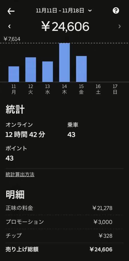 | 11/15(金) | 10 | 3時間12分 | \4,337 | \1,355 |