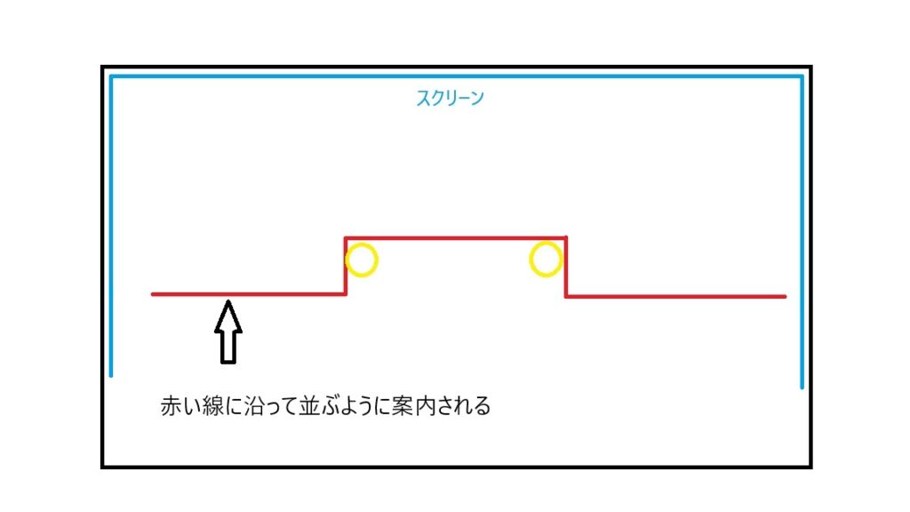 ここでは ↑ みたいにくぼみがある赤い線沿いに並ぶようアナウンスされます
